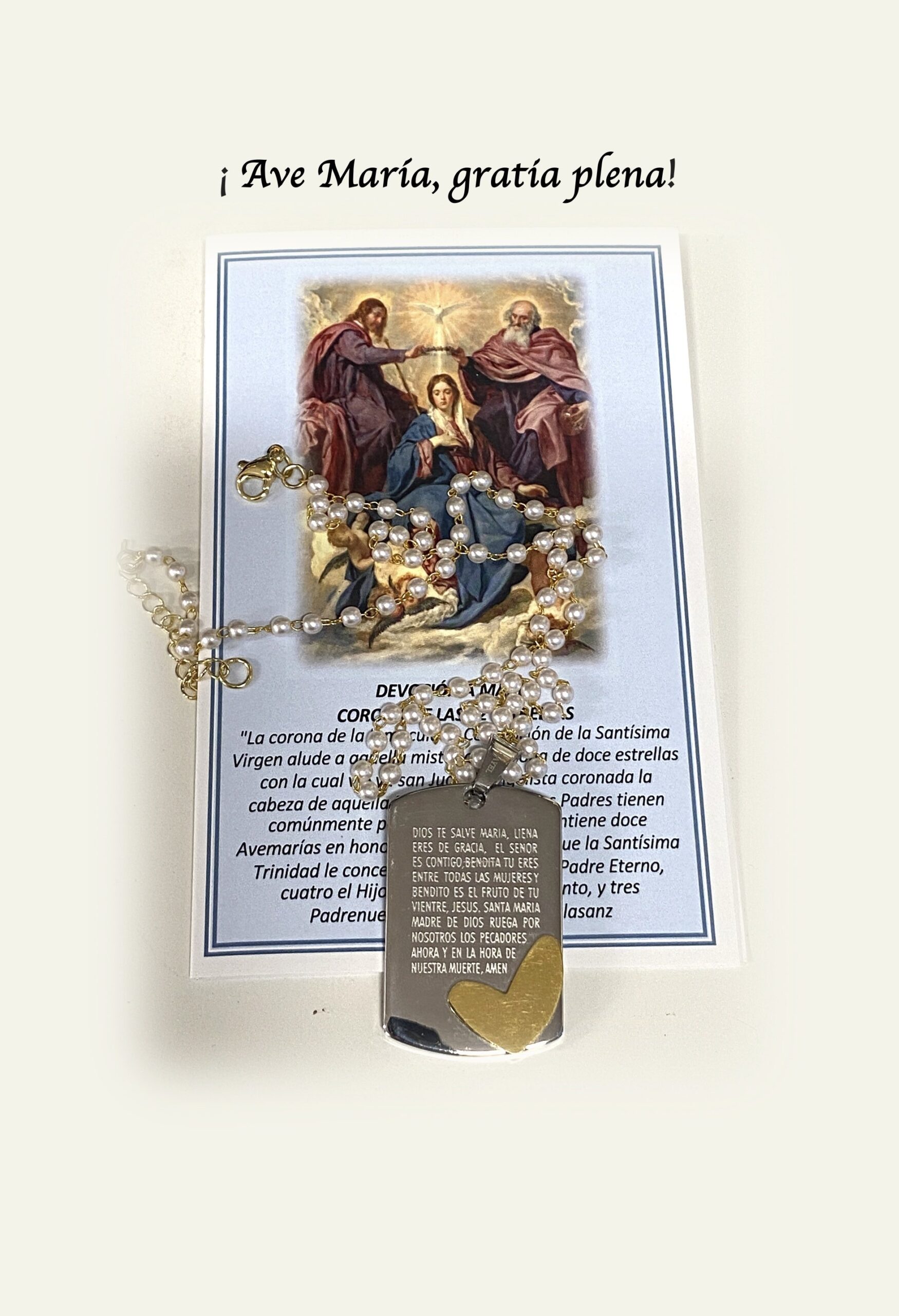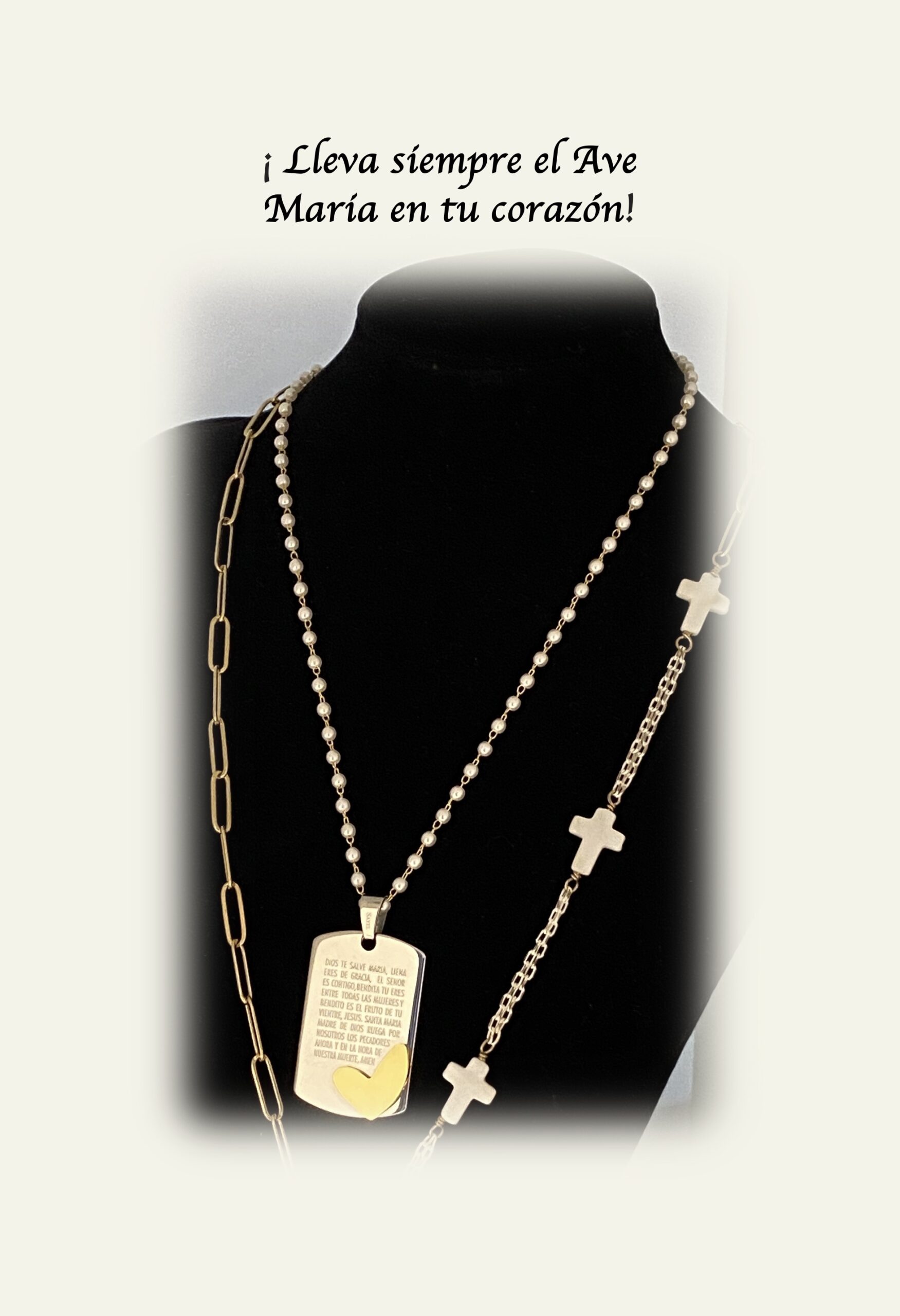 Placa en acero inoxidable con el Ave Maria de 3,5 cm x 2,5 cm con cadena de perlas sintéticas de 3 mm aproximadamente .