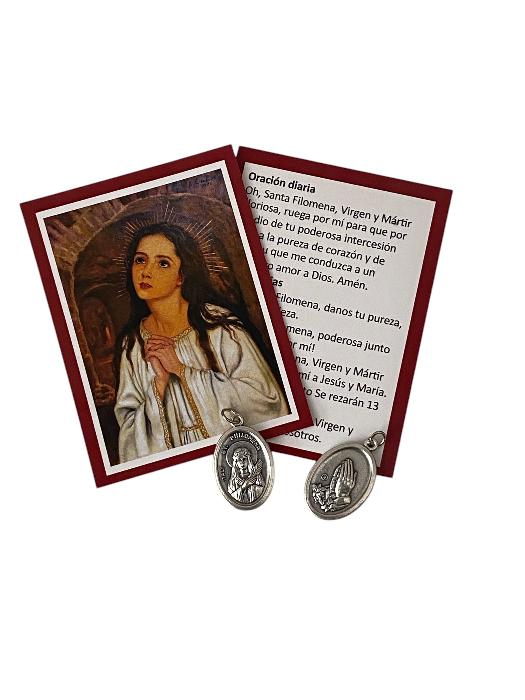 Medalla de Santa Filomena ovalada en metal plateado, con una medida de 2,5 cm de alto.