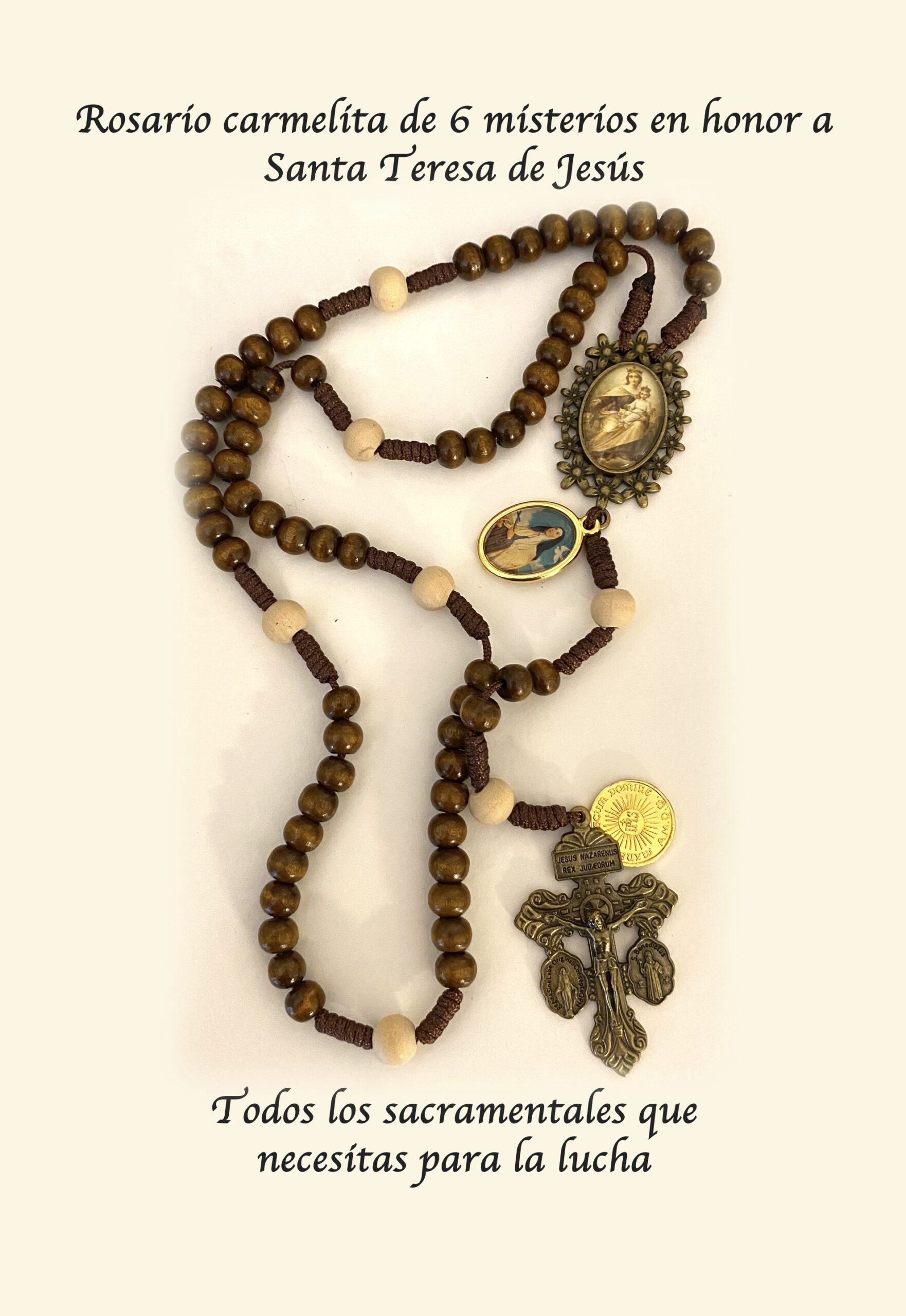 - Rosario carmelita de 6 misterios en madera con los mas poderosos sacramentales